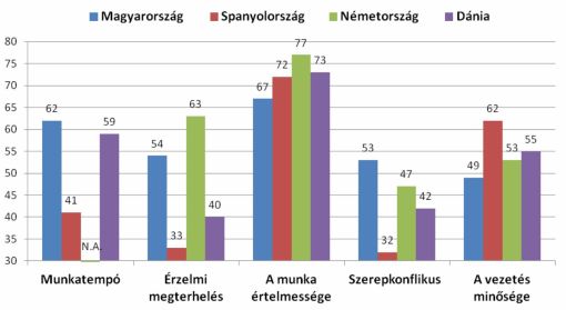 A COPSOQ II kérdőív lehetővé tesz nemzetközi szintű összehasonlítást is. Spanyol, német és dán országos összehasonlításban Magyarország elég rosszul szerepel, a magyar munkavállalók stressz szintje kétszerese a dánokénak. A munkahelyi stressz tényezők közül a munka értelmességében (67), a vezetés minőségében (49) és a munkahelyi elégedettségben (53) is Magyarország érte el a legalacsonyabb pontszámot. Az érzelmi megterhelés viszont alacsonyabb hazánkban (54), mint a németeknél (63), illetve a munkahely iránti elkötelezettség magasabb a magyar dolgozók körében (50), mint a spanyoloknál (38).