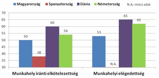 Nemzetközi összehasonlítás a COPSOQ II kérdőívvel a munkahelyi elégedettség és a munkahely iránti elkötelezettség szerint (magyar minta: 13104 fő, nem reprezentatív)